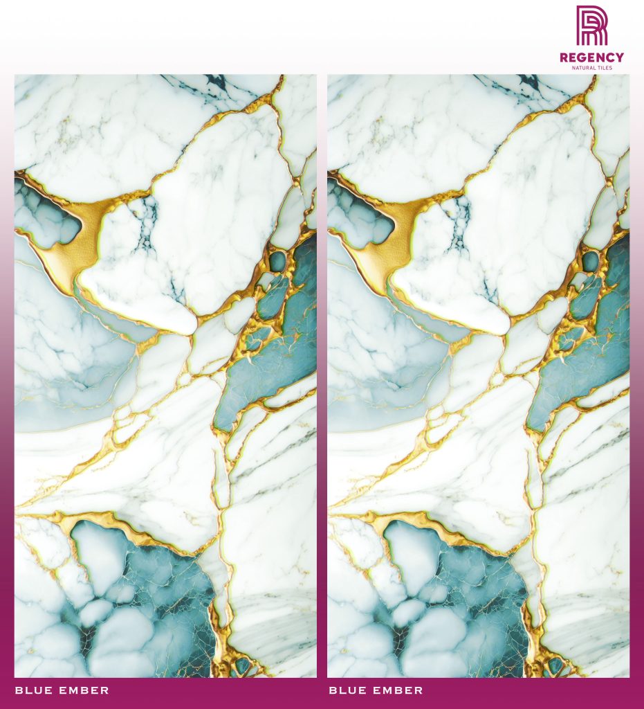 The Blue Ember Series is a large 600 mm x 1200 mm Glazed Vitrified Tile (GVT) featuring a dramatic design blending deep blue and warm tones. The Super High-Gloss (SHG) finish creates an intense, mirror-like surface for maximum luxury.