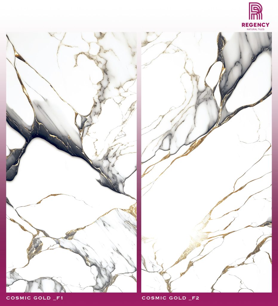 The Cosmic Gold Series is a large 600 mm x 1200 mm Glazed Vitrified Tile (GVT) with a bold, natural stone design accented with gold tones. The Super High-Gloss (SHG) finish creates an intense, mirror-like surface for maximum luxury.