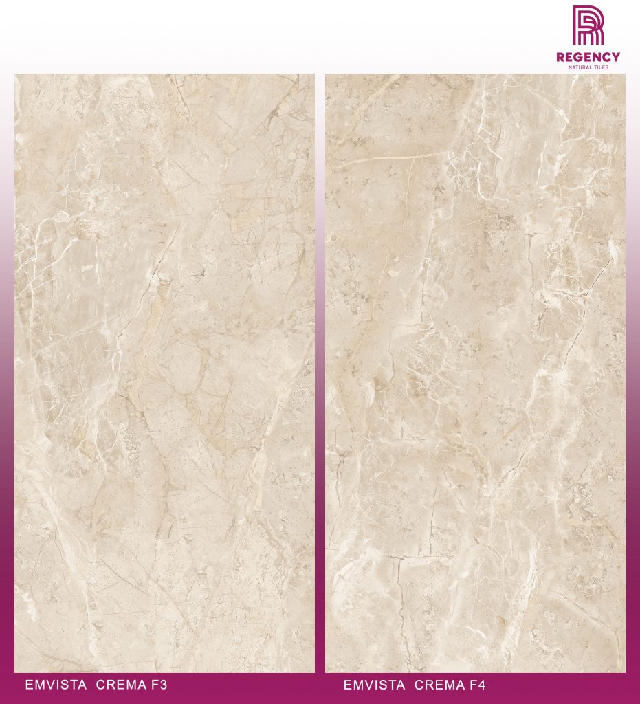 The Emvista Crèma Series is a large 600 mm x 1200 mm Glazed Vitrified Tile (GVT) in a warm, creamy beige pattern. The design is available across Polished, Carving, and Matt finishes.