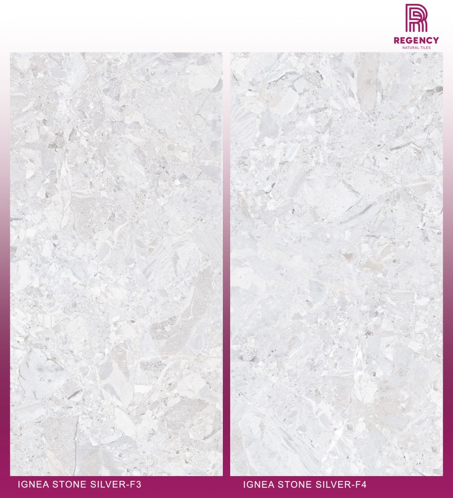 The Ignea Stone Silver Series is a large 600 mm x 1200 mm Glazed Vitrified Tile (GVT) in a contemporary grey stone design with metallic tones. It is available in both a Polished (Glossy) finish and a Matt finish.