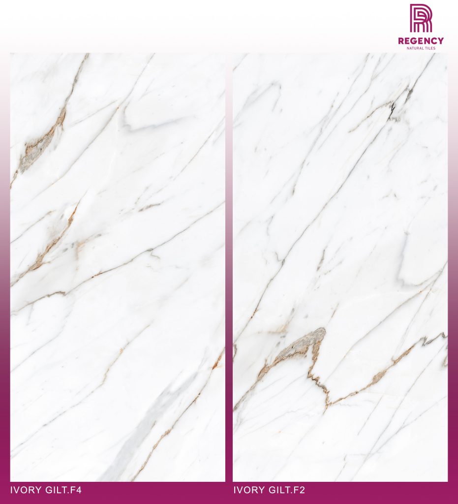 The Ivory Gilt Series is a large 600 mm x 1200 mm Glazed Vitrified Tile (GVT) in a bright, ivory color with subtle gold accents. The Polished Carving finish combines 3D engraved texture with a high-gloss surface for luminous depth.