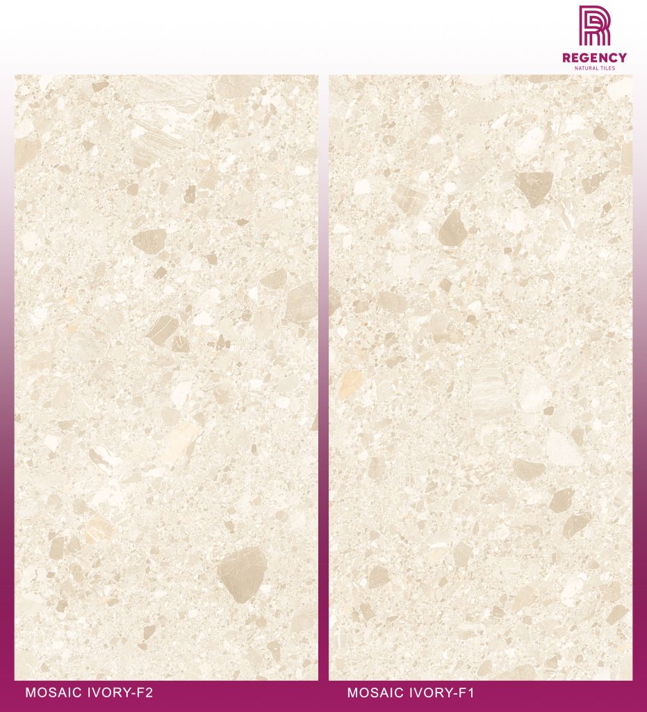 The Mosaic Ivory Series is a large 600 mm x 1200 mm Glazed Vitrified Tile (GVT) featuring a decorative mosaic pattern on a creamy ivory background. The Polished finish provides a high-gloss, mirror-like surface that enhances vibrancy.