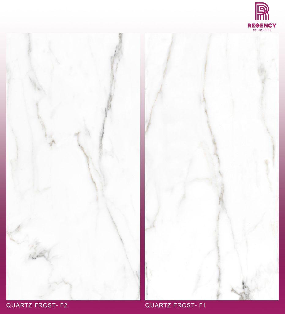 The Quartz Frost Series is a large 600 mm x 1200 mm Glazed Vitrified Tile (GVT) in a bright, light-colored quartz design. It is available in both a Polished (Glossy) finish and a Matt finish.